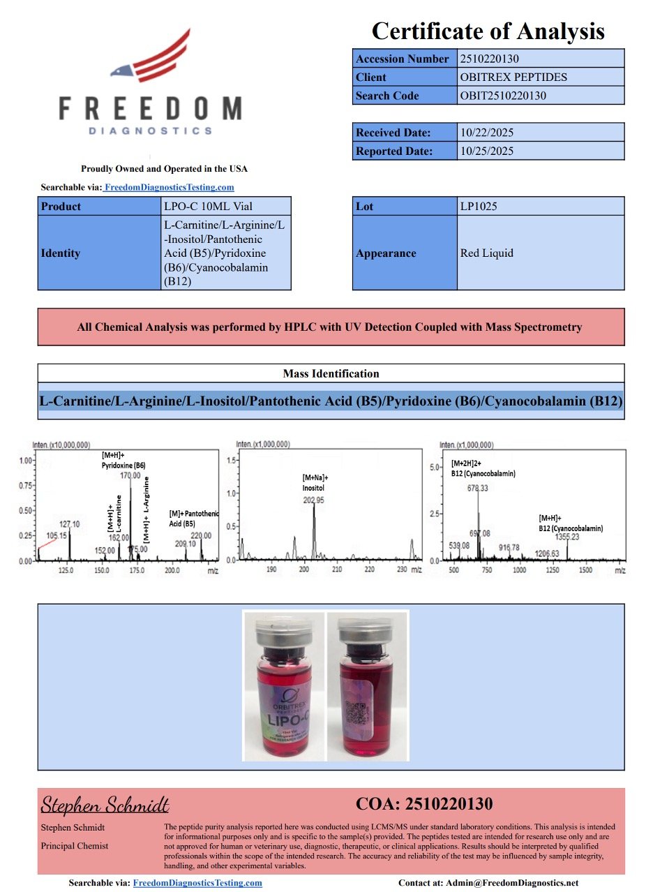 LIPO C is intended strictly for research purposes. It is not approved for human consumption or clinical use. Proper laboratory handling, storage, and safety guidelines must always be followed to maintain peptide integrity and ensure safe experimental procedures.