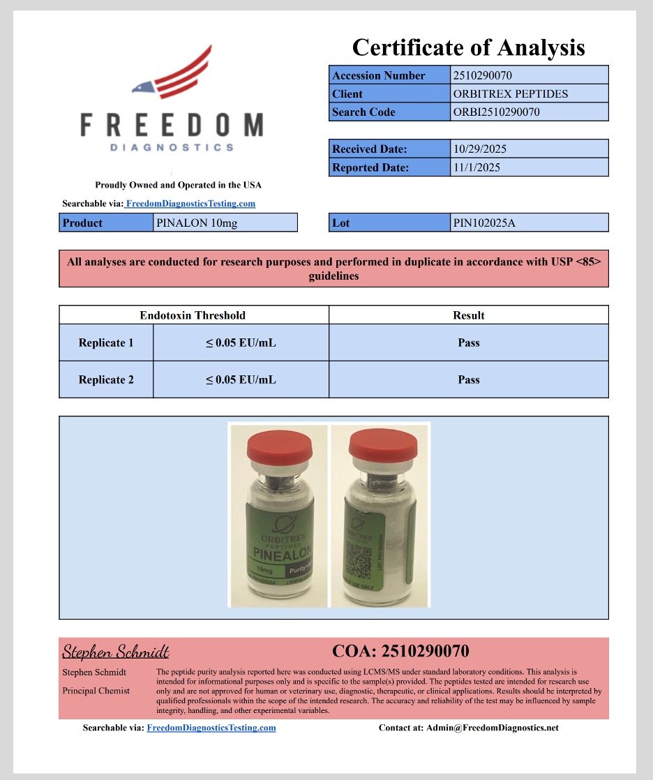 All Pinealon 10mg batches are tested to meet strict research-grade standards.