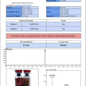 PT 141 is intended strictly for research purposes. It is not approved for human consumption or clinical use. Proper laboratory handling, storage, and safety guidelines must always be followed to maintain peptide integrity and ensure safe experimental procedures.